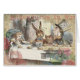 Alice's Adventures in Wonderland at the mad tea party - This image is based on the original classic Alice book, from the mid-1800s, showing Alice sitting at the end of the table in a big, overstuffed chair, having an unbirthday party with the white rabbit, a mouse, and the Mad Hatter. Written by Lewis Carroll in 1865, Alice falls down a rabbit hole and finds fantasy.
