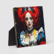 Imagining Alice as the Red Queen fantasy AI generated art in the colours of red,blue,yellow, black and white with ink splatters.