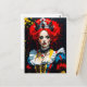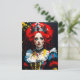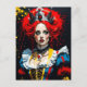 Imagining Alice as the Red Queen fantasy AI generated art in the colours of red,blue,yellow, black and white with ink splatters.