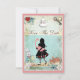 Elegant, whimsical vintage Alice in Wonderland collage wedding save the date flat cards. On the front of these cute shabby chic colourful blue and pink invitations a pretty Alice silhouette carrying a cute whimsical pink flamingo , the grinning Cheshire cat, a teapot, glamourous gold pocket watch, jam tart heart, and the white rabbit with his pocket watch. The background is a beautiful colourful blue vintage journal paper with blue roses and white daisies and antique key. There is a pretty pink border with tiny hearts. On the reverse of these lovely, fun invites is the same background with a cute drink me bottle, jam tart heart, teacup and saucer. PLEASE NOTE: All products on Zazzle have flat printed images. All of the text is fully customisable to meet your needs and you can change the font style, colour and size of font if you desire. If you need any assistance customising your product please contact me through my store and I will be happy to help. I have matching products in my store.