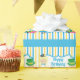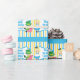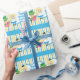 Cute Alice in Wonderland blue and yellow striped wrapping paper for a book themed birthday. Little girl Alice in her blue dress and the Mad Hatter sit next to your custom HAPPY BIRTHDAY message for a bookworm birthday girl.