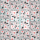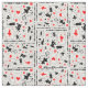 Alice in Wonderland in black, white and red on white background. Patterns include Alice, Mad Hatter, White Rabbit, Cheshire Cat, Card Soldiers, pocket watch, cards and roses.