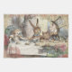 Alice in Wonderland mad tea party - Alice's Adventures in Wonderland has this wonderful image of The Mad Tea Party. This is based on the original classic Alice book, from the mid-1800s, showing Alice sitting at the end of the table in a big overstuffed chair, the white rabbit, a mouse, and the Mad Hatter. Written by Lewis Carroll in 1865, Alice falls down a rabbit hole and finds fantasy.