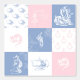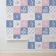 A great Alice in Wonderland patchwork quilt design with Alice, the girl from the children's book, the White Rabbit, Cheshire Cat and Mad Hatter, alnog with blocks of vintage tea pots and pocket watches, in pink, blue and white, makes a pretty and fun literary themed wall paper for a nursery or children's room.