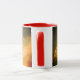 Coffee Mug with a painting of Alice in Wonderland looking at the caterpillar sitting in the mushroom smoking a hookah pipe. This painting has a red filter.