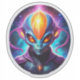 An alien in a futuristic suit with glowing orange eyes, with a cosmic background.