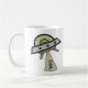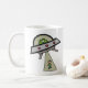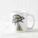 Alien Abduction design features extra terrestrial alien pilot in flying saucer sending beam down to capture earthling for inspection and probing.