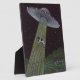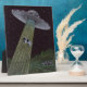 A colour pencil drawing of an unfortunate cow being abducted by aliens in a flying saucer on a dark, starry night. The frightened herd huddles in the background.