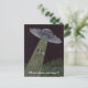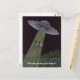 A colour pencil drawing of an unfortunate cow being abducted by aliens in a flying saucer adorns this fun postcard! Customise by changing the text to suit yourself!