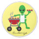 Green Martian type alien grilling food on the barbecue to customise, personalise by changing to your name