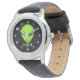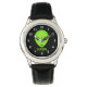 Green Alien cartoon watch personalised with kids name or monogram letter. Cute space theme timekeeper clock design for little boys Birthday party. Make one for son, grandson, new baby, grandchild etc. Extraterrestrial life form illustration for children.