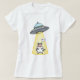 A humorous cartoon scene showing a wide-eyed cow standing under a glowing yellow beam from a classic flying saucer. The UFO hovers above with metallic details and small glowing lights, creating a playful sci‑fi vibe. The cow’s round body, tiny hooves, and surprised expression add charm and comedy, while a small speech bubble saying “Moo!” enhances the fun storytelling. Clean lines, bright colors, and strong contrast against the dark background make the illustration bold and eye-catching.