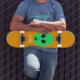 Show your moves on this Alien Head Green Orange Personalised Kids skateboard. It is designed with a bright green alien head sticking out his tongue on the centre of customisable bright orange background. Name is in bold white lettering. Makes a great gift idea for science fiction, outer space and UFO lovers. Click personalise template option and enter name.