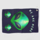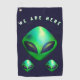 Cool fun golf towel with a printed image of 3/three green alien heads on a very dark blue background,