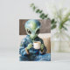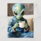 Alien in Blue PJs with a Coffee Postcard