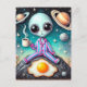 A funny Alien dressed in pjs with a morning coffee and a fried egg sitting on a rock