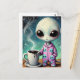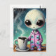 A funny Alien dressed in pjs with an extra dark morning coffee