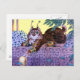 Under a golden sky, surrounded by violet flowers, an alien, 6 legged, bejeweled alien kitty relaxes by a lily pool. Humourous gift for all ages but especially appropriate for children.