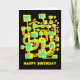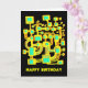 A colourful abstract network like structure perhaps reminiscent of a circuit or map of some kind. Digitally painted in yellow and turquoise with a red offset giving it an offset stenciled look. The design was partly created using digital oil paint effects which gives it an attractive hand painted stenciled look. Happy Birthday on the front and inside. A smaller black and white drawing of the front design is also used to decorate the text inside.
