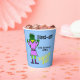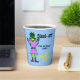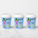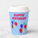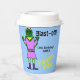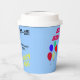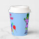 Cute hand-painted alien robot girl Captain Zoey with light purple spacesuit and flower belt. Blast Off Party Fun written in fun black and yellow typography. Happy Birthday is written on backside in black text above colourful flying ballloons. disposable paper cups. Original Artwork Design © 2014 TamiraZDesigns.