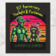 Two aliens stand close in a colourful sunset, their bright eyes full of emotion. The love they share radiates as UFOs drift above them, creating an ethereal and cosmic atmosphere. This striking image combines love, mystery, and the allure of an intergalactic bond between the two figures.