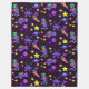 A cute space scene filled with yellow stars, colourful planets and adorable characters. A green alien with rocket shoes, an alien flower in a flowerpot, a retro futuristic rocket car with a lady and her pet cat riding in it, and a flying saucer with a happy alien poking its eyes out. With MLO, the artists signature, tucked under the planets.