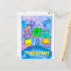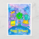 A fun happy birthday postcard featuring three whimsical alien creatures in bright colours standing on a planet in outer space with planets and stars illustrated with watercolor.