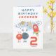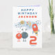 Send a 2 year old fan of outer space this design of a spaceship, cute alien characters and moon and stars on a white background. Easily personalize the text to your own requirements.