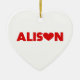 The name Alison with the letter o replaced with a red love heart. The colours can be changed.