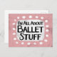 "I'm All About Ballet Stuff" is a cute text design in pink with black text, along with a white accent shape and white textured whimsical dots surrounding it.