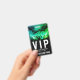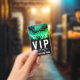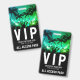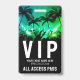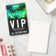 This VIP badge features a bold green and black design, perfect for an outdoor concert or a party with a Coachella vibe. Along the top, silhouettes of palm trees stretch across a vibrant green sky, creating a lively and energetic festival vibe. The image fades into black at the bottom, where the event name, date, and “All Access Pass” are displayed in a clean, bold white sans serif font. “VIP” is shown at the top in the same simple style for a sleek, modern look.
