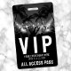 This VIP badge features a bold black and white design with grayscale artwork, perfect for an outdoor concert or a party with a Coachella vibe. Along the top, silhouettes of palm trees stretch across a moody grayscale sky, giving the design a cool and modern festival feel. The image fades into solid black at the bottom, where the event name, date, and “All Access Pass” are displayed in a clean, bold white sans serif font. “VIP” is shown at the top in the same simple style for a sleek, minimalist look.