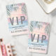 This VIP badge features a dreamy pastel pink and blue sunset setting over the ocean and sandy beach, creating a soft and relaxing coastal vibe. Gentle sunset hues blend across the sky and reflect onto the water, giving the design a warm, inviting feel. Palm tree fronds frame the top of the badge, adding a tropical touch and enhancing the beachside atmosphere.