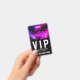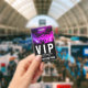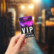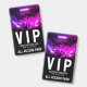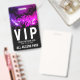 This VIP badge features a bold pink, purple, and black design, perfect for an outdoor concert or a party with a Coachella vibe. Along the top, silhouettes of palm trees stretch across a vibrant pink and purple sky, setting a fun and energetic festival mood. The image fades into black at the bottom, where the event name, date, and “All Access Pass” are displayed in a clean, bold white sans serif font. “VIP” is shown at the top in the same simple style for a sleek, modern look.