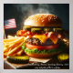 Indulge in pure burger bliss with this mouthwatering creation. A thick, juicy beef patty, grilled to perfection, is layered with melted cheddar cheese, crispy bacon, fresh lettuce, ripe tomato slices, and tangy pickles. All nestled between a toasted sesame seed bun and served with a side of golden, crispy fries. A miniature American flag adds a patriotic touch, making this a true celebration of classic American flavours.