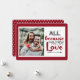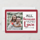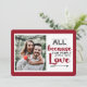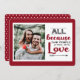 This lovely greeting card is perfect for Valentine's Day, or anniversaries, and it features the caption "All because two people fell in love", written in red and dark grey modern fonts on a white background, and decorated with tiny hearts and a grey arrow. You can add your picture to the front.
