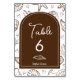 This All I Sea Is Love Brown Seashells Table Number features a warm earthy brown background decorated with whimsical doodles of seashells, starfish, hearts, sparkles, and other coastal touches. A solid brown arch with a thin white interior arch sits centered on the card, creating a refined space for your text. Inside the arch, “All I Sea Is Love” appears at the top, followed by editable names, a small seashell illustration, and the table number. Fully customizable, it’s perfect for rustic beach weddings, boho coastal themes, and earthy shoreline celebrations.