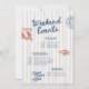 The invitation features a whimsical handwritten font that adds a personal and playful touch, inviting guests to join in the festivities with warmth and style. Adorning the invitation are charming hand-drawn illustrations of seafood, including lobsters, shrimp, and oysters. These delightful sketches create a lively and vibrant atmosphere, perfectly complementing the seaside theme. The design features a nostalgic blue and red color palette, evoking the classic charm of vintage seaside postcards. This retro color scheme adds a touch of fun and elegance, making the invitation a standout piece.