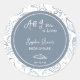 These All I Sea Is Love Dusty Blue Seashells Doodles Classic Round Stickers feature a soft dusty blue background filled with whimsical seashell, starfish, heart, and sparkle doodles that add a charming coastal feel. In the center, a solid dusty blue circle outlined with a thin white inner ring frames your editable details. Inside the circle, the phrase “All I Sea Is Love” appears at the top, followed by a customizable space for the bride’s name, “Bridal Shower,” a small seashell, and the event date below. These stickers make the perfect finishing touch for favors, envelopes, party bags, and décor. All text and colors are fully editable to suit your celebration.