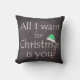 Flirty Christmas throw Pillows with vintage black chalkboard background, cute green santa elf hat, candy cane accent and white typography. All I want for Christmas is you. See more at Quote Life Boutique.
