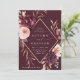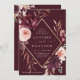 This wedding invitation features a watercolor flower wreath of dahlias, garden roses, and peony in burgundy red, maroon, and blush pink over fall leaves with a faux gold diamond shape frame and wedding details on the back. For more advanced customisation of this design, please click the BLUE DESIGN TOOL BUTTON. Matching items are also available.