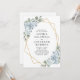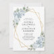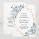 All in One QR Code Dusty Blue Floral Gold Geometric Frame Wedding Invitation... Our "front and back" blue floral wedding invitation features bouquets of dusty blue flowers on a gold geometric frame bordering your personalised invitation text. The back of the invitation contains all of the details you would typically see on separate cards within the wedding packet, including the QR code for your wedding website -- which you can create right on Zazzle's Personalisation template. This modern style all in one wedding invitation was designed to be both elegant and budget conscious... as well as time-saving. All example text on both sides can be easily revised with your own information on the personalisation template.