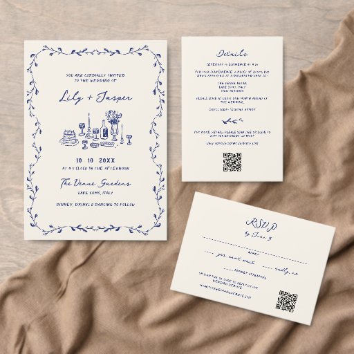 All In One Blue Hand Drawn QR Code Wedding Invitation