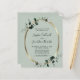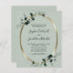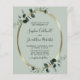 Budget All in One Eucalyptus Gold Metallic Sage Wedding Invitation... Our budget "All in One" luxe botanical wedding invitation features a gold metallic oval frame embellished with emerald-hued eucalyptus leaves over a light sage green background. The light sage back of the card contains all of the details you would typically see on separate cards in the wedding packet. This modern style wedding invitation was designed to be both elegant and budget conscious... not to mention time-saving. On the back there is also a QR code graphic template you can replace with your own code (or delete if you don't plan to use one). All example text can be easily revised with your own information on the personalisation template. PLEASE NOTE: Budget cards do not automatically come with envelopes, as do the traditional invitations, but you can purchase them on the same page at checkout if you wish. This all in one design is also available on a traditional 5x7 wedding invitation card.