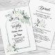 Invite your friends and loved ones to your wedding with this elegant all-in-one cotton flower and eucalyptus greenery arch wedding invitation. Designed for the budget-savvy couple, this invitation includes the reception information, RSVP request details, and any other information you may wish to include on the reverse side of the invitation, saving you the cost of purchasing extra postage and wedding stationery.