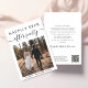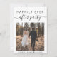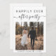 Elegant elopement or smaller wedding announcement and all-in-one wedding reception invitation. The front features your photo, "Happily Ever After Party" in a mix of simple typography and a chic script with swashes, and your first names and wedding date joined together by a heart. On the back, personalise your details, input your wedding website address to create a QR code for guests to scan to see your wedding photos, all the details and to RSVP online, and add your names in a signature-like script.