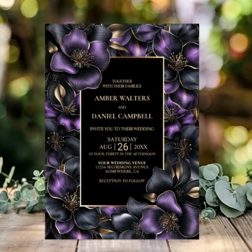 Make a statement with our black all-in-one wedding invitation featuring a purple and grey floral motif. This design sets the tone for an unforgettable celebration. The customisable text allows you to effortlessly add the bride and groom’s names, wedding date, and the necessary details of your celebration. Designed for the budget-savvy couple, the reception venue location, RSVP response request, accommodation details, and any other information your guests may require can be included on the reverse side of this invitation, saving money on extra stationery. A variety of paper types and corner styles are available for your unique invitations, along with the option to download.