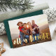 Festive holiday photo card features your favourite horizontal or landscape orientated photo in full bleed, with "all is bright" overlaid in gold foil hand lettered brush typography. Personalise the front of the card with your names and short holiday message (shown with "merry Christmas"), and add three additional photos to the back in a collage layout on a forest green background, along with a custom personal message. For a blank back, simply delete the photo templates and white mat layer.