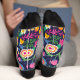 These are socks that has a black type of background with many colourful flowers.