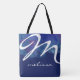 A simple and stylish monogrammed deep-blue tote bag